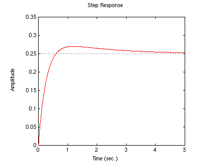 As you can see from the above plot all the control objectives have been met without the use of an integral controller (settling time for this example is considered achieved when the response is less than 2% of it's final value). Remember, that for a control problem there is more than one solution for the problem.