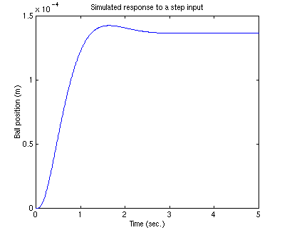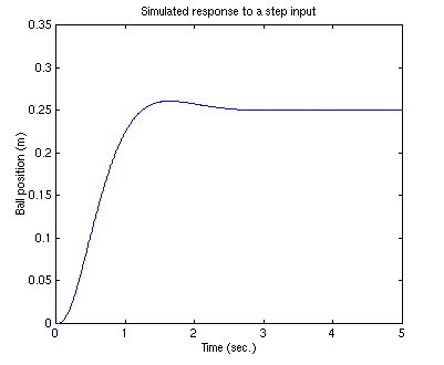 From this plot we see that there is a large steady state error for which we will need to add reference input (explained in next section). However, the overshoot and settling time criteria are met. If we wanted to reduce the overshoot further than we would make the imaginary part of the pole smaller than the real part. Also, if we wanted a faster settling time we would move the poles further in the left-half plane. Feel free to experiment with the pole positions to see these trends.
