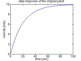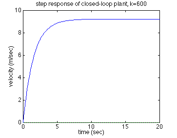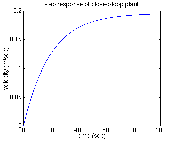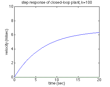 Now, the low frequency gain is about 6dB (magnitude 2) which predicts the steady-state error of 33%. The bandwidth frequency is about 0.1 rad/sec so that the rise time should be around 18 seconds. Let's take a look at the closed-loop step response and confirm these.
