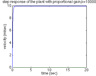 As you can see from the plot, both the steady-state error and the rise time do not satisfy our design criteria. You can increase the proportional gain (Kp) to improve the system output. Change the existing m-file so that Kp equal 10000 and rerun it in the Matlab command window. You should see the following plot.