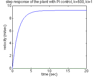 Recall from the PID tutrial page, an addition of an integral controller to the system eliminates the steady-state error. For now, let Kp equals 600 and Ki equals 1 and see what happens to the response. Change your m-file to the following.