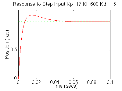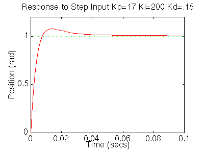 Kp=17; Ki=200; Kd=0.15; numcf=[Kd Kp Ki]; dencf=[1 0]; numf=conv(numcf,num); denf=conv(dencf,den); [numc,denc]=cloop(numf,denf,-1); t=0:0.001:0.1; step(numc,denc,t)Rerun it and you should get this plot: