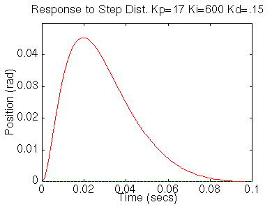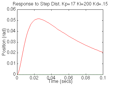 We now can see that the step response has a settling time of roughly 40ms, it has less than 16% overshoot, and it has no steady state error. The step disturbance response also has no steady state error. So now we know that if we use a PID controller with