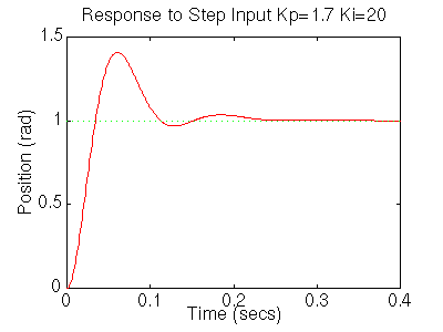 Now we see that the response is faster than before, but the large Ki has worsened the transient response (big overshoot). Let's now try a PID controller to reduce the overshoot. Go back to the m-file and make the following changes to look at the step response.