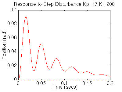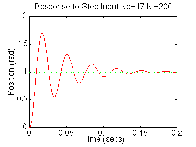 The settling time is still too long. Let's increase the gains in order to speed up the response. Go back to your m-file and change Ki to 200 and Kp to 17. Rerun the file and you should get plots like these: