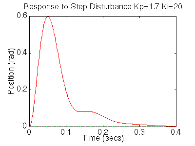From the plots above we see that although the steady-state error looks good the settling time is too large, as is the overshoot. We also see that the steady-state error to a disturbance is large. Recall from PID tutorial page that adding an integral term will eliminate the steady-state error and a derivative term will reduce the overshoot. Let's first try a PI controller to get rid of the disturbance steady state error. Change your m-file so it looks like: