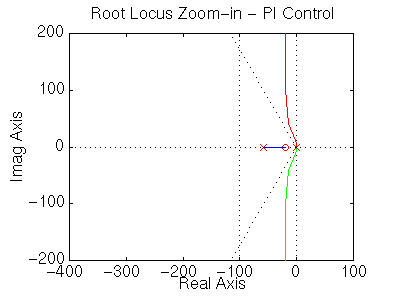 We can see from this plot that the closed-loop poles are never fast enough to meet the settling time requirement (that is, they never move to the left of the sigma=100 vertical line). Also, recall that we need an integrator in the controller (not just in the system) to remove steady-state error due to a disturbance.