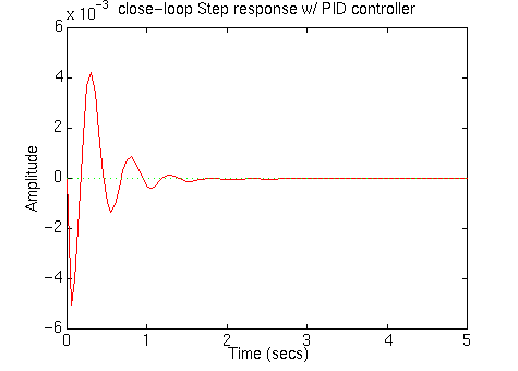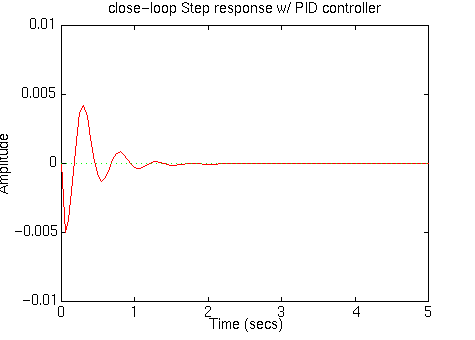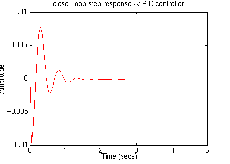 Now that we have the closed-loop transfer function, controlling the system is simply a matter of changing the KD,KP,and KI variables. From the figure above, we can see that the system has larger damping than required, but the settling time is very short. This response still doesn't satisfy the 5% overshoot requirement. As mentioned before, this can be rectified by adjusting the KD, KP and KI variables to find better response. Let's increase KP,KI,KD by 2 times to see what will happen. Go back to your m-file and multiply KP,KI,KD by 2 and then rerun the program, you should get the following plot: