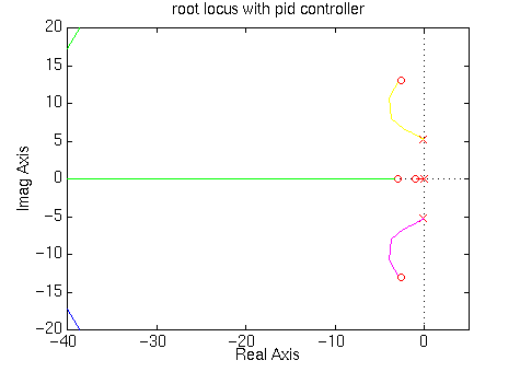 For this problem, it turns out that the PID design method adequately controls the system. This can been seen by looking at the root locus plot. Such a task can be achieved by simply changing only the gains of a PID controller. Feel free to play around with all three of the parameters,KD,KP and KI, as we suggested, but you will most likely get the response to have either large percent overshoot or very long settling time. But if you do find a good PID design, please email us with your results! We are always interested in different ways to solve our examples; we may include your solution in a future version of these tutorials.
