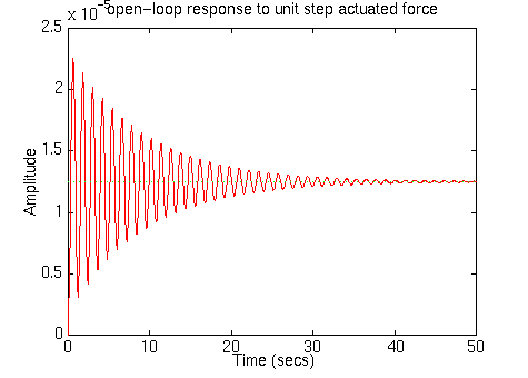 From this graph of open-loop response for unit step actuated force, we can see that the system is under-damped, when the unit step actuated force is applied. People sitting in the bus will feel a very small amount of oscillation and the steady-state error is about 0.013 mm. Moreover, the bus takes an unacceptably long time to reach the steady state. The solution to this problem is to add a feedback controller into the system's block diagram.