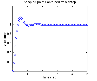 To plot a step response of a discrete system, we will use two separate Matlab functions, dstep and stairs. The dstep will be used to obtain N number of output sample points, where N is supplied by an user. The stairs plots a stairstep graph of supplied vectors, namely the time vector [t] and the amplitude vector [x].
