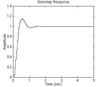 The function stairs connects these sample points in a way that it represents the output y(k) preceded by zero-order hold. Let's use stairs to connect these sample points. Add the following commands to the above m-file and rerun it. You should get the following stairstep response.