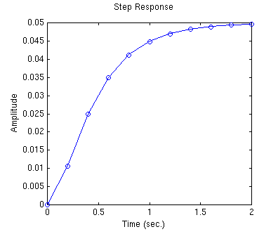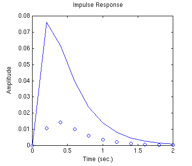 From this plot, we see that the discrete response exactly matches with the continuous response at each instant of sampling time. This is true because the input was a time-invarying step function. Had the input been a continuously time-varying function, it would not have matched exactly with the continuous response. This can be seen by changing the input of the same system from the example above from the step to the impulse. In the above m-file, change step to impulse and dstep to dimpulse. Re-running this m-file gives you the following plot.
