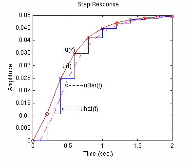 the average signal uBar(t) lags the continuous signal u(t) by T/2 sec. However, if you decrease the sampling time (Ts, in sec/sample), this lagging effect becomes small and uBar(t) closely matches the continuous signal u(t).