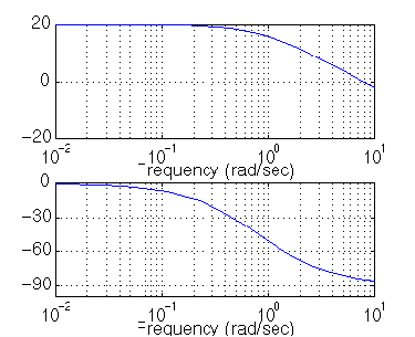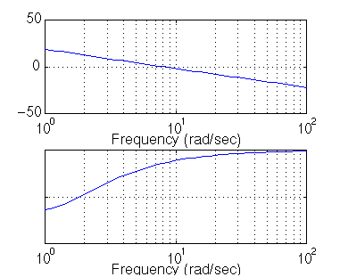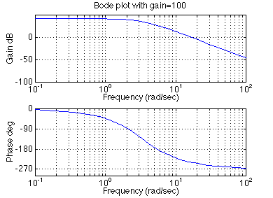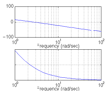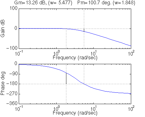 num = [10]; den = [1.25, 1]; numPI = [1]; denPI = [1 0]; newnum = conv(num,numPI); newden = conv(den,denPI); bode(newnum, newden, logspace(0,2))