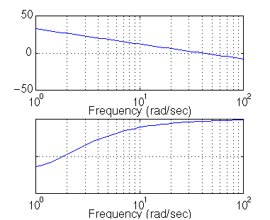 num = [10]; den = [1.25, 1]; numPI = 5*[1 1]; denPI = [1 0]; newnum = conv(num,numPI); newden = conv(den,denPI); bode(newnum, newden, logspace(0,2))