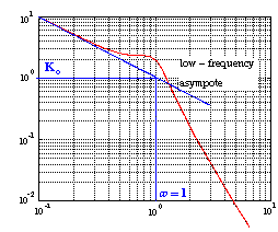 The last major point of interest is steady-state error. The steady-state error can be read directly off the Bode plot as well. The constant (Kp, Kv, or Ka) are located at the intersection of the low frequency asymptote with the w=1 line. Just extend the low frequency line to the w=1 line. The magnitude at this point is the constant. Since the Bode plot of this system is a horizontal line at low frequencies (slope = 0), we know this system is of type zero. Therefore, the intersection is easy to find. The gain is 20dB (magnitude 10). What this means is that the constant for the error function it 10. Click here to see the table of system types and error functions. The steady-state error is 1/(1+Kp)=1/(1+10)=0.091. If our system was type one instead of type zero, the constant for the steady-state error would be found in a manner similar to the following