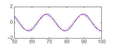 w= 0.3; num = 1; den = [1 0.5 1 ]; t=0:0.1:100; u = sin(w*t); [y,x] = lsim(num,den,u,t); plot(t,y,t,u) axis([50,100,-2,2])