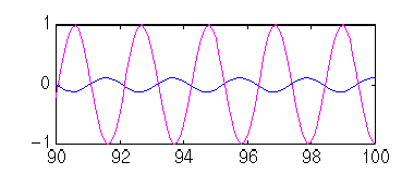 w = 3; num = 1; den = [1 0.5 1 ]; t=0:0.1:100; u = sin(w*t); [y,x] = lsim(num,den,u,t); plot(t,y,t,u) axis([90, 100, -1, 1])