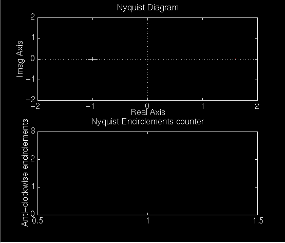 This movie shows how to count encirclements of the -1 point by the Nyquist diagram. Whenever another counterclockwise encirclement is realized, the counter on the bottom increases by 1.
